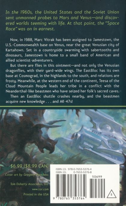 Marc Vitrac was born in Louisiana in the early 1960's, about the time the first interplanetary probes delivered the news that Mars and Venus were teeming with life—even human life. At that point, the "Space Race" became the central preoccupation of the great powers of the world.Now, in 1988, Marc has been assigned to Jamestown, the US-Commonwealth base on Venus, near the great Venusian city of Kartahown. Set in a countryside swarming with sabertooths and dinosaurs, Jamestown is home to a small band of American and allied scientist-adventurers.But there are flies in this ointment – and not only the Venusian dragonflies, with their yard-wide wings. The biologists studying Venus's life are puzzled by the way it not only resembles that on Earth, but is virtually identical to it. The EastBloc has its own base at Cosmograd, in the highlands to the south, and relations are frosty. And attractive young geologist Cynthia Whitlock seems impervious to Marc's Cajun charm.Meanwhile, at the western end of the continent, Teesa of the Cloud Mountain People leads her tribe in a conflict with the Neanderthal-like beastmen who have seized her folk's sacred caves. Then an EastBloc shuttle crashes nearby, and the beastmen acquire new knowledge... and AK47's.Jamestown sends its long-range blimp to rescue the downed EastBloc cosmonauts, little suspecting that the answer to the jungle planet's mysteries may lie there, among tribal conflicts and traces of a power that made Earth's vaunted science seem as primitive as the tribesfolk's blowguns. As if that weren't enough, there's an enemy agent on board the airship... Extravagant and effervescent, The Sky People is alternate-history SF adventure at its best.