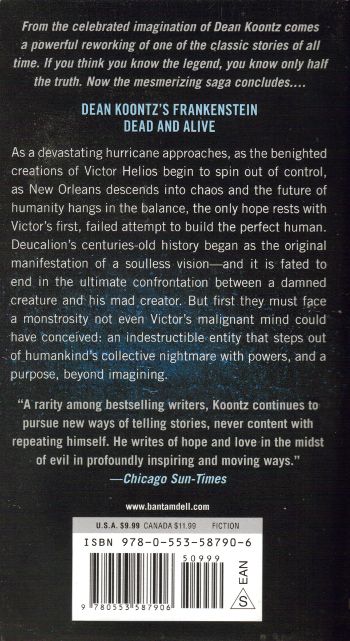 From the celebrated imagination of Dean Koontz comes a powerful reworking of one of the classic stories of all time. If you think you know the legend, you know only half the truth. Now the mesmerizing saga concludes. . . .As a devastating hurricane approaches, as the benighted creations of Victor Helios begin to spin out of control, as New Orleans descends into chaos and the future of humanity hangs in the balance, the only hope rests with Victor’s first, failed attempt to build the perfect human. Deucalion’s centuries-old history began as the original manifestation of a soulless vision–and it is fated to end in the ultimate confrontation between a damned creature and his mad creator. But first they must face a monstrosity not even Victor’s malignant mind could have conceived–an indestructible entity that steps out of humankind’s collective nightmare with powers, and a purpose, beyond imagining.