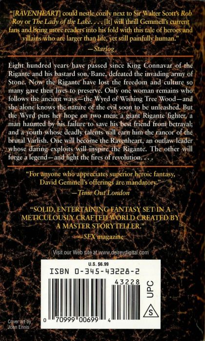 Eight hundred years have passed since King Connavar of the Rigante and his bastard son, Bane, defeated the invading army of Stone. Now the Rigante have lost the freedom and culture so many gave their lives to preserve. Only one woman remains who follows the ancient ways–the Wyrd of Wishing Tree Wood–and she alone knows the nature of the evil soon to be unleashed. But the Wyrd pins her hope on two men: a giant Rigante fighter, a man haunted by his failure to save his best friend from betrayal; and a youth whose deadly talents will earn him the rancor of the brutal Varlish. One will become the Ravenheart, an outlaw leader whose daring exploits will inspire the Rigante. The other will forge a legend–and light the fires of revolution. . . .