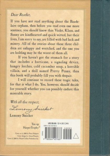 Dear Reader, If you have not read anything about the Baudelaire orphans, then before you read even one more sentence, you should know this: Violet, Klaus, and Sunny are kindhearted and quick-witted, but their lives, I am sorry to say, are filled with bad luck and misery. All of the stories about these three children are unhappy and wretched, and this one may be the worst of them all.If you haven't got the stomach for a story that includes a hurricane, a signalling device, hungry leeches, cold cucumber soup, a horrible villain, and a doll named Pretty Penny, then this book will probably fill you with despair.I will continue to record these tragic tales, for that is what I do. You, however, should decide for yourself whether you can possibly endure this miserable story. With all due respect, Lemony Snicket
