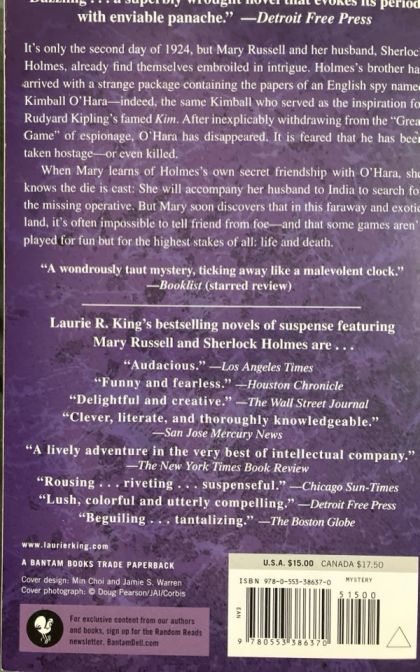 It’s only the second day of 1924, but Mary Russell and her husband, Sherlock Holmes, find themselves embroiled in intrigue. It starts with a New Year’s visit from Holmes’s brother Mycroft, who comes bearing a strange package containing the papers of an English spy named Kimball O’Hara—the same Kimball known to the world through Kipling’s famed Kim. Inexplicably, O’Hara withdrew from the “Great Game” of espionage and now he has just as inexplicably disappeared. When Russell discovers Holmes’s own secret friendship with the spy, she knows the die is cast: she will accompany her husband to India to search for the missing operative. But Russell soon learns that in this faraway and exotic land, it’s often impossible to tell friend from foe—and that some games aren’t played for fun but for the highest stakes of all…life and death.BONUS: This edition contains an excerpt from Laurie R. King's Garment of Shadows.