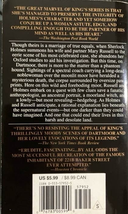 Though theirs is a marriage of true equals, when Sherlock Holmes summons his wife and partner Mary Russell to the eerie scene of his most celebrated case, she abandons her Oxford studies to aid his investigation. But this time, on Dartmoor, there is more to the matter than a phantom hound. Sightings of a spectral coach carrying a long-dead noblewoman over the moonlit moor have heralded a mysterious death, the corpse surrounded by oversize paw prints. Here on this wild and foreboding moor, Russell and Holmes embark on a quest with few clues save a fanatic anthropologist, an ancestral portrait, a moorland witch, and a lowly- but most revealing- hedgehog. As Holmes and Russell anticipate, a rational explanation lies beneath the supernatural events- but one darker than they could have imagined. And one that could end their lives in this harsh and desolate land.
