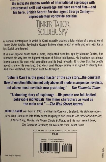 John le Carre's classic novels deftly navigate readers through the intricate shadow worlds of international espionage with unsurpassed skill and knowledge and have earned him -- and his hero, British Secret Service agent George Smiley -- unprecedented worldwide acclaim.A modern masterpiece in which le Carre expertly creates a total vision of a secret world, Tinker, Tailor, Soldier, Spy begins George Smiley's chess match of wills and wits with Karla, his Soviet counterpart.It is now beyond doubt that a mole, implanted decades ago by Moscow Centre, has burrowed his way into the highest echelons of British Intelligence. His treachery has already blown some of its most vital operations and its best networks. It is clear that the double agent is one of its own kind. But which one? George Smiley is assigned to identify him. And once identified, the traitor must be destroyed.