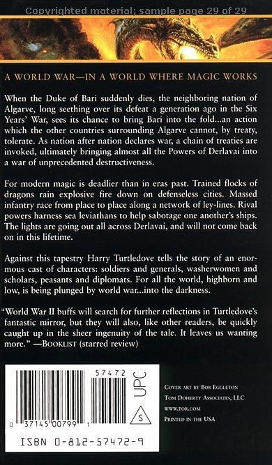 When the Duke of Bari suddenly dies, the neighboring nation of Algarve, long seething over its defeat a generation ago in the Six Years' War, sees its chance to bring Bari into the fold...an action which the other countries surrounding Algarve cannot, by treaty, tolerate. As nation after nation declares war, a chain of treaties are invoked, ultimately bringing almost all the Powers of Derlavai into a war of unprecedented destructiveness.For modern magic is deadlier than in ears past. Trained flocks of dragons rain explosive fire down on defenseless cities. Massed infantry race from place to place along a network of ley-lines. Rival powers harness sea leviathans to help sabotage one another's ships. The lights are going out all across Derlavai, and will not come back on in this lifetime.Against this tapestry Harry Turtledove tells the story of an enormous cast of characters: soldiers and generals, washerwomen and scholars, peasants and diplomats. For all the world, highborn and low, is being plunged by world war...into the darkness.
