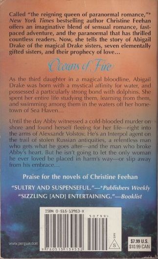 #1 New York Times bestselling author Christine Feehan tells the story of Abigail Drake, one of seven elementally gifted sisters who are fated to find great love.As the third daughter in a magical bloodline, Abigail Drake was born with a mystical affinity for water, and possessed a particularly strong bond with dolphins. She spent her entire life studying them, learning from them, and swimming among them in the waters off her hometown of Sea Haven...Until the day Abby witnessed a cold-blooded murder on shore, and found herself fleeing for her life—right into the arms of Alexsandr Volstov. He’s an Interpol agent on the trail of stolen Russian antiquities, a relentless man who gets what he goes after—and the man who broke Abby’s heart. But he isn’t going to let the only woman he ever loved be placed in harm’s way—or slip away from his embrace.