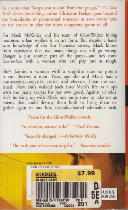 #1 New York Times bestselling author Christine Feehan goes beyond the boundaries of paranormal romance as two lovers take to the streets to play the most dangerous game of all. For Mack McKinley and his team of GhostWalker killing machines, urban warfare is an art. But despite a hard-won knowledge of the San Francisco streets, Mack knows from experience that too many things can still go wrong. Danger is just another part of the game—and now he’s come face-to-face with a woman who can play just as tough. Jaimie is a woman with a sapphire stare so potent it can destroy a man. Years ago she and Mack had a history—volatile, erotic, and electric. Then she vanished. Now she’s walked back into Mack’s life as a spy with too many secrets for her own good. Against all odds, she’s hooking up with Mack one more time to take on an enemy that could destroy them both, or bring them back together in one hot, no-holds-barred adrenaline rush.