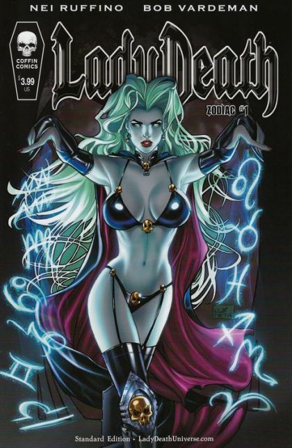 Lady Death: Zodiac, lushly illustrated with insane detail by Nei Ruffino and written by Bob Vardeman, explores the twelve signs of the Zodiac from a pagan perspective with the diva of death front and center. It's the zodiac as only Lady Death can present it: dark, dangerous and diabolical.