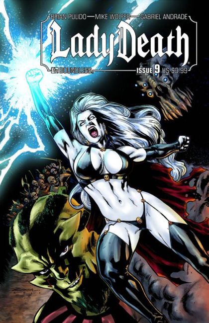 Cover: Gabriel Andrade Writer: Brian Pulido and Mike Wolfer Art: Gabriel Andrade Lady Death's war against the mischievous Death Queen continues! After learning that the kingdom ruled by Satasha had entered into a secret alliance with Death Queen, Lady Death was determined to burn New Aberffraw to the ground. But the unbridled wrath of the albino goddess has been momentarily redirected, as Death Queen's unstoppable enforcer, Behemoth, his legion of undead warriors and giant, lava-spewing spiders launches a terrifying offensive upon the city in a search for Lady Death and the rebel leader, Wargoth. As the earth-shaking battle commences, secrets will be revealed, lovers will die and double-crosses will be exposed, but will there be anything left of the besieged kingdom for the blood-splattered victors to rule? Co-written by Mike (Gravel, Wolfskin) Wolfer and original creator Brian Pulido, this arc features the art of amazing new talent Gabriel Andrade who also provides the Regular and Wraparound covers for this issue! Also available with a special Art Deco Retailer Order Incentive by painter Michael Dipascale!