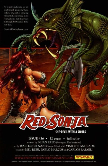 by Brian Reed & Walter Geovani Following the shocking pages of Red Sonja #34, a bold new direction begins here from writer Brian Reed (Ms. Marvel) and Walter Geovani (Savage Tales)! Everything you knew about Red Sonja and her world was forever changed when the She-Devil battled Kulan Gath to the death! Now, following her trip to Hades, the spirit of the She-Devil is reborn, though the world around her has forever changed! A perfect jumping on point for new readers, as well as an incredible continuation to the readers that have been there since issue #0! Featuring covers by definitive Red Sonja artist Mel Rubi and Carlos Rafael & Pablo Marcos!