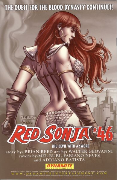 Writer: Brian Reed Penciller/Inker: Walter Geovani The countdown to issue #50 continues as events once again push Red Sonja towards a destiny unfilled! Continuing the quest for the Blood Dynasty, Sonja and Osin find themselves caught amongst the victims of the Dynasty and their very fate hangs in the balance! From writer Brian Reed, artist Walter Geovani and cover artists Fabiano Neves, Jackson Herbert and Paul Renaud!