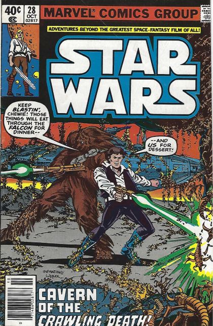 "Whatever Happened to Jabba the Hut?!" Written by Archie Goodwin. Art by Carmine Infantino and Gene Day. After the notorious gangster, Jabba the Hut, refuses Han's latest offering to make good on a debt, Solo and his co-pilot, the wookie Chewbacca, desperately try get the Millennium Falcon up and running before a swarm of flesh-eating insects eat through the hull of their ship. And proceed to devour them for dessert! Cover price $0.40.