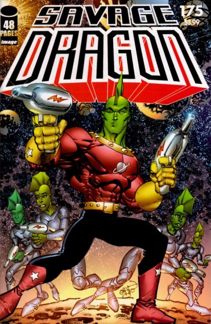 story ERIK LARSEN art / cover ERIK LARSEN SAVAGE DRAGON IS BACK! Or is he? Special 48-page anniversary issue! A certain green-skinned, fin-headed freak finds himself aboard a spaceship headed for parts unknown and has to begin making sense of his new life and the new reality which surrounds him. Meanwhile on Earth, Malcolm Dragon faces his greatest challenge yet: the omnipotent OverLord! And waiting in the wings--an alien invasion! Plus: Vanguard faces? Universo?