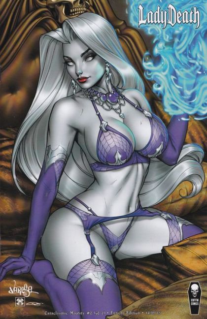 "Deathocalypse", an official year long company wide event unfolds here! Caprice's mental manipulations unleashed Lady Death's evil side and New Orleans paid the price in wanton death and destruction. Recovered, Lady Death is now seen worldwide as a villain to be feared and eliminated. Meanwhile, the extinction-level villain Insurrectus and his new mate Atrocity plan to usher in a new horrific age of terror. Can the diva of death overcome this catastrophic crusade she struggles against her own wicked appetites, or are we all doomed once and for all?