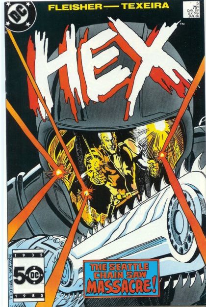 More bristling Hex action in "The Seattle Chain Saw Massacre"! Characters: Jonah Hex; Stiletta; Reinhold Borsten; Chain. Written by Michael Fleisher, with art and cover by Mark Texeira and Carlos Garzon. Cover price $0.75.