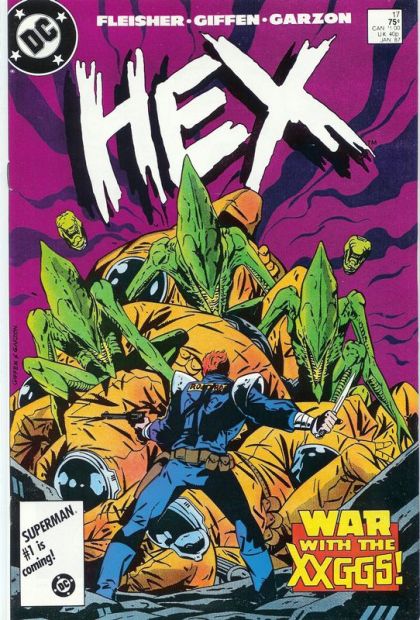 "War with the Xxggs!" It's Hex's time to howl when he and the fearsome Dogs of War become unlikely allies in the battle against the Xxgg Liquidation Team. Written by Michael Fleisher, with art and cover by Keith Giffen and Carlos Garzon. Cover price $0.75.