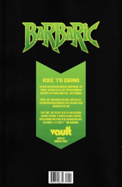 It's the moment we've all been waiting for - the start of an all-new arc of BARBARIC! Follow Owen and his magical companion, the tender, talking Axe as they spread kindness and hope in a world gone bad...just kidding! Owen, Axe, and Soren are back, and so is all the mayhem and bloodshed that follows them wherever they go! This time, they're out to settle an old score against Gladius, a wicked a$$hole who did Owen wrong way back in his barbarian days. As always...it's just f***ing barbaric.