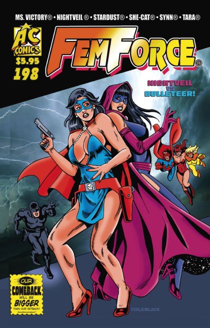 Nightveil's Cloak of Darkness, a cosmic force beyond imagination, is free from control by the sorceress and the wizard, Azagoth. It's first course of action... destroy the Blue Bulleteer! Can Femforce stop this attack and save Laura Wright? Written, inked, and colored by Femforce creator Bill Black!
