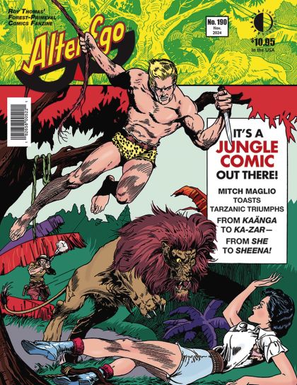 'It's a Jungle Comic Out There!' in Alter Ego #190 as Mitch Maglio, historian of the Fiction House group, examines vintage jungle heroes from Kaänga to Ka-Zar... from She to Sheena not to mention Rulah, Frank Buck, Jo-Jo/Congo King, Lorna, Jungle Jim, Princess Pantha, Congo Bill, Dorothy Lamour, Thun'da, Cave Girl, and - oh yes! - Tarzan of the Apes! With art by Lou Fine, Will Eisner, Frank Frazetta, Matt Baker, Bob Powell, Robert Webb, Alex Schomburg, Fran Hopper, H.C. Kiefer, Ralph Mayo, Maurice Whitman, Joe Doolin, John Celardo, and many others! Plus, the comic book career of real-life jungle explorers Martin and Osa Johnson, FCA, Mr. Monster's Comic Crypt, and more!