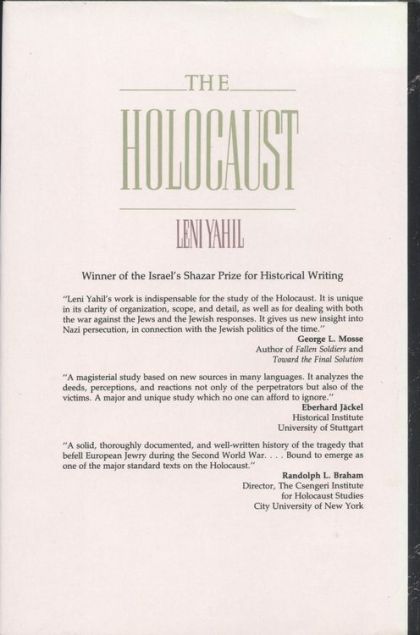 When The Holocaust first appeared in Israel in 1987, it was hailed as the finest, most authoritative history of Hitler's war on the Jews ever published. Representing twenty years of research and reflection, Leni Yahil's book won the Shazar Prize, one of Israel's highest awards for historical work. Now available in English, The Holocaust offers a sweeping look at the Final Solution, covering not only Nazi policies, but also how Jews and foreign governments perceived and responded to the unfolding nightmare.The Holocaust is astonishingly comprehensive. Yahil weaves a gripping chronological narrative that stretches from the Norwegian fjords to the Greek islands, from Amsterdam to Tehran--and even Shanghai. Her writing is balanced, objective, and compelling, as she systematically explores the evolution of the Holocaust in German-occupied Europe, probing its politics, planning, goals, and key figures. Yahil uses her command of the many relevant languages to marshal an impressive array of documentary and statistical evidence, driving her narrative forward with telling details and personal accounts--such as a survivor's description of her perseverance during a death march, or the story of the Struma, a boat that sank with over 700 Jewish refugees when the British refused to receive it in Palestine.Along the way, she destroys persistent myths about the Holocaust: that Hitler had no plan for exterminating the Jews, that the Jews themselves went peacefully to the slaughter. Though Yahil finds that Nazi policies were often inconsistent, particularly during the years before the war, she conclusively demonstrates that Hitler was always working toward a final reckoning with world Jewry, envisioning his war as a war against the Jews. The book also recounts numerous uprisings and acts of resistance in ghettos and concentration camps, as well as the activities of Jewish partisan units. Yahil describes the work of Jews in America, Palestine, and world organizations on behalf of Hitler's victims--often in the face of resistance by the Allied governments and neutral states--and explores the factors that affected the success of rescue efforts.The Holocaust is a monumental work of history, unsurpassed in scope and insightful detail. Objective yet compassionate, Leni Yahil brings together the countless diverse strands of this epic event in a single gripping account.