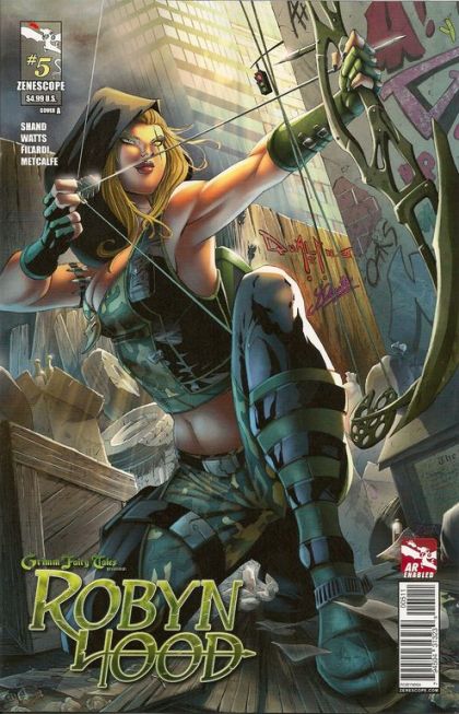 As the rebellion rages on through the city of Bree, everything is on the line for Robyn. Trapped in the fairy tale realm of Myst for over a year, she has become the voice of the revolution and a hero to the people. Everything is on the line as Robyn faces off against the wicked King John and his champion, Guy of Gisbourne, in a battle to the death. Zenescope's epic miniseries comes to a shocking end in this oversize finale, 'Robyn Hood's Death.'