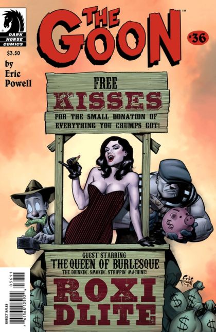 Eric Powell (W/A/Cover) and Dave Stewart (C) Zombie gangs, killer robots, beasts beyond reckoning, and stuck in the middle is Goon! But can the titular powerhouse resist the wicked allure of femme fatale guest star Roxi Dlite-the 2010 Queen of Burlesque? Will Franky be able to pick his tongue off of the ground before issue's end?! Find out the stunning and sultry answers in a new madcap issue of The Goon!