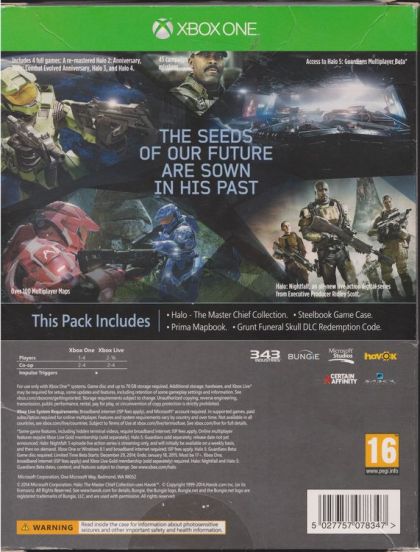 Zum ersten Mal erscheint die vollständige Master Chief-Saga in einer ultimativen Edition vereint: Halo: Combat Evolved Anniversary, Halo 2: Anniversary, Halo 3 und Halo 4 – alle für Xbox One komplett überarbeitet – mit 60 fps, 45 Kampagnen-Missionen, über 100 Multiplayer-Maps (inklusive der originalen Combat Evolved-Maps) sowie den Spartan Ops-Maps. Abgerundet wird das Paket der Halo: The Master Chief Collection durch die Live Action Serie Halo: Nightfall von Executive Producer Ridley Scott und einem exklusiven Zugang zur Halo: 5 Guardians Multiplayer-Beta.