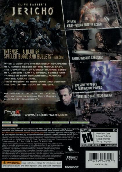 Clive Barker präsentiert in Zusammenarbeit mit Codemasters seine neuste Schreckensvision - „Jericho“: Bevor Gott Adam und Eva erschuf, misslang seine erste Schöpfung. Sein „Erstgeborener“ war abgrundtief böse, ohne Seele. Verbannt in alle Ewigkeit brennt der Erstgeborene auf Rache und bereitet das Ende der Menschheit vor. Schauplatz ist die vergessene Wüstenstadt Al-Khali, wo plötzlich übernatürliche Störungen auftreten. Archäologen, die dort an Ausgrabungen arbeiteten, sind verschwunden. Dorthin wird das Jericho-Team geschickt – eine Sondereinsatztruppe, geschult an modernen Waffen und in okkulten Techniken. Doch das, was Ihnen hier bevorsteht, geht weit über das Vorstellbare hinaus… „Clive Barker’s Jericho“ kombiniert eine faszinierende Hintergrundgeschichte, die Jahrhunderte überspannt, und interessante Charaktere mit einem furiosen Ego-Shooter-Ereignis, das erwachsene Spieler mit viel Action, atemloser Atmosphäre und krassen Horror-Elementen in den Bann ziehen wird.