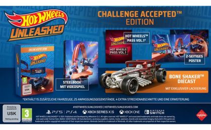 Hol dir das ultimative Erlebnis mit dieser Special Edition nach Hause! Das Videospiel in einem einzigartigen Hot Wheels Steelbook, der Bone Shaker als Modell mit einer exklusiven Lackierung, der HOT WHEELS Pass Vol. 1 mit 15 Fahrzeugen, 25 Anpassungsgegenständen, 4 Streckenabschnitten, einer thematischen Erweiterung und ein zweiseitiges, gefaltetes HOT WHEELS UNLEASHED-Poster warten auf dich!