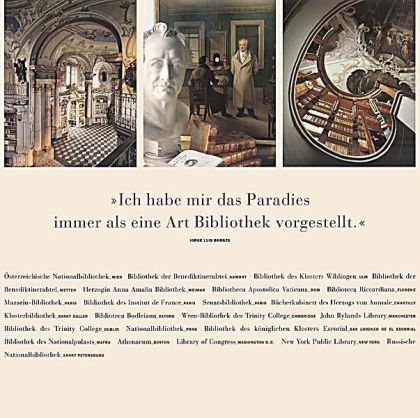 Verlagstext: Der Dichter Jorge Luis Borges schrieb einmal: "Ich habe mir das Paradies immer als eine Art Bibliothek vorgestellt." Welch passendes Motto für diesen Bildband über die Bewahrungsstätten des kulturellen Erbes der Menschheit, von den Lesestuben der mittelalterlichen Klöster über die prunkvollen Hofbibliotheken des Barocks bis zu den großen Nationalbibliotheken von heute. Unter den über 20 Vorgestellten finden sich u.a. die Herzogin Anna Amalia Bibliothek in Weimar, die Bibliothek der Benediktinerabtei in Metten, die Österreichische Nationalbibliothek in Wien, die Stiftsbibliothek in St. Gallen, die Biblioteca Apostolica Vaticana in Rom, das Bücherkabinett des Herzogs von Aumale in Chantilly, die Tschechische Nationalbibliothek in Prag, die Library of Congress in Washington DC und die Russische Nationalbibliothek in St. Petersburg. Ein Prachtband und Geschenkbuch mit vielen sechsseitigen Falttafeln und großem Serviceteil.