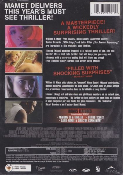 Seemingly mild-mannered businessman Edmond Burke visits a fortuneteller and hears a remark that spurs him to leave his wife abruptly and seek what is missing from his life. Encounters with strangers and unsavory people weaken the barriers encompassing his long-suppressed rage, until Edmond explodes in violence.