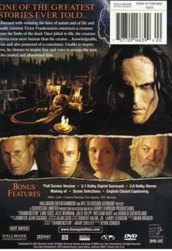 Frankenstein is a 2004 U.S. television miniseries (edited into a film) based on the book Frankenstein by Mary Shelley. It follows the original book more closely than other adaptions. The story is of a scientist who brings life to a creature fashioned from corpses and various body parts.