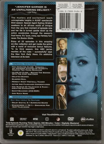 Alias is an American action/drama television series created by J.J. Abrams which was broadcast on ABC from September 30, 2001 to May 22, 2006, spanning five seasons. It starred Jennifer Garner as Sydney Bristow, an agent who had been tricked to believe she was working for the U.S. government but had, in fact, been working for a criminal organization named the Alliance of Twelve. Upon learning this Sydney became a double agent for the real CIA, feeding information from SD-6 to them.