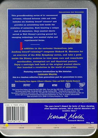 This groundbreaking series of 31 uncensored cartoons, released between 1929 and 1939, includes six Academy Award(R) winners and provides an astonishing look inside the evolution of animation. Each boasting a unique cast of characters, these musical shorts served as Walt Disney's proving ground for emerging technology, new musical styles, and experimental forms. In addition to the cartoons themselves, join Academy Award(R)-winning composer Richard M. Sherman (MARY POPPINS) for an overview of the "Silly Symphony" series, and take a peek inside the Disney archives to view some rare and remarkable merchandise, conceptual art, and theatrical posters. Enjoy a nostalgic look back at the original musical shorts that launched a revolution in the world of animation. Featuring exclusive introductions by film historian Leonard Maltin, this is a timeless collection from generations past for generations to come.