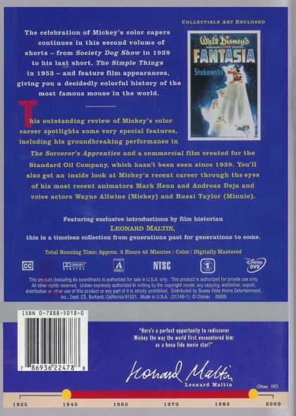 The celebration of Mickey's color capers continues in this second volume of shorts -- from "Society Dog Show" in 1939 to his last short, "The Simple Things," in 1953 -- and feature film appearances, giving you a decidedly colorful history of the most famous mouse in the world. This outstanding review of Mickey's color career spotlights some very special features, including his groundbreaking performance in "The Sorcerer's Apprentice." You'll also get an inside look at Mickey's recent career through the eyes of his most recent animators, Mark Henn and Andreas Deja, and voice actors Wayne Allwine (Mickey) and Russi Taylor (Minnie). Featuring exclusive introductions by film historian Leonard Maltin, this is a timeless collection from generations past for generations to come.