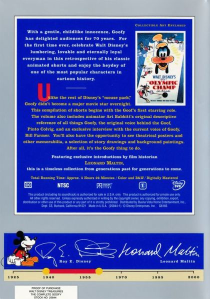 With a gentle, childlike innocence, Goofy has delighted audiences for 70 years. For the first time ever, celebrate Walt Disney's lumbering, lovable, and eternally loyal everyman in this retrospective of his classic animated shorts and enjoy the heyday of one of the most popular characters in cartoon history. Unlike the rest of Disney's "mouse pack," Goofy didn't become a major movie star overnight. This compilation of shorts begins with the Goof's first starring role. The volume also includes animator Art Babbitt's original descriptive reference of all things Goofy, the original voice behind the Goof, Pinto Colvig, and an exclusive interview with the current voice of Goofy, Bill Farmer. You'll also have the opportunity to see theatrical posters and other memorabilia, a selection of story drawings, and background paintings. After all, it's the Goofy thing to do. Featuring exclusive introductions by film historian Leonard Maltin, this is a timeless collection from generations past for generations to come.