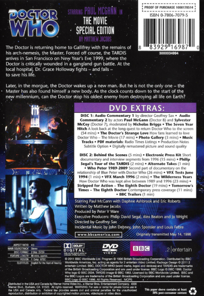 The Doctor, an alien time traveller from the planet Gallifrey, is transporting the remains of his nemesis, the Master back to their homeworld. However the Master is not as dead as the Doctor thinks. The Master's essence escapes and sabotages the TARDIS, the Doctor's time machine causing it to crash land in San Franscisco on December 30th 1999. The Doctor requires a beryllium atomic clock to repair the TARDIS, but is shot as he leaves it. Taken to hospital, the Doctor's seventh regeneration is triggered by a surgeon, confused by his alien physiology, while the Master takes over a paramedic's body. He needs a Time Lord's body to survive and be able to regenerate again so he needs the Doctor's. The newly regenerated the Doctor must fight to save his own eighth body, and the world when the Master sabotages the TARDIS' power source. By midnight on December 31st 1999, the Earth will be pulled through this power-source, a mini-black hole, and only the Doctor can stop if only he can remember ...