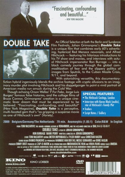 Director Johan Grimonprez casts Alfred Hitchcock as a paranoid history professor, unwittingly caught up in a double take on the cold war period. Subverting a meticulous array of TV footage and using 'The Birds' as an essential metaphor, DOUBLE TAKE traces catastrophe culture's relentless assault on the home, from moving images' inception to the present day.