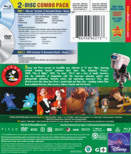 Disney and Pixar present an incredible new collection of 12 short films, featuring multiple Academy Award® nominees (Best Short Film, Animated: "Presto," 2008; "Day & Night," 2010; "La Luna," 2011) and a host of family favorites. Join the celebration of imagination with this collection, packed with unforgettable animation, fantastic stories and captivating characters. Plus, enjoy all-new extras that share how Pixar's storied talent got their start — including student films from acclaimed directors John Lasseter, Andrew Stanton and Pete Docter!