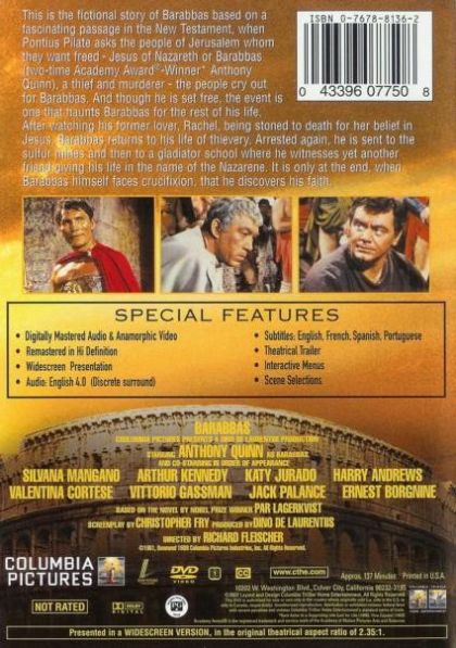 Epic account of the thief Barabbas, who was pardoned for his crimes and spared crucifixion when Pilate offered the Israelites a choice to pardon Barabbas or Jesus. Struggling with his spirituality, Barabbas goes through many ordeals leading him to the gladiatorial arena, where he tries to win his freedom and confront his inner demons, ultimately becoming a follower of the man who was crucified in his place.