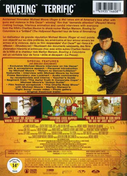 This is not a film about gun control. It is a film about the fearful heart and soul of the United States, and the 280 million Americans lucky enough to have the right to a constitutionally protected Uzi. From a look at the Columbine High School security camera tapes to the home of Oscar-winning NRA President Charlton Heston, from a young man who makes homemade napalm with The Anarchist's Cookbook to the murder of a six-year-old girl by another six-year-old. Bowling for Columbine is a journey through the US, through our past, hoping to discover why our pursuit of happiness is so riddled with violence.