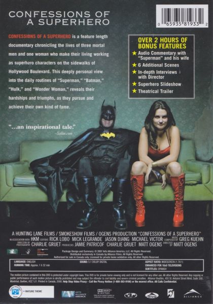 CONFESSIONS OF A SUPERHERO is a feature length documentary chronicling the lives of three mortal men and one woman who make their living working as superhero characters on the sidewalks of Hollywood Boulevard. This deeply personal view into their daily routines reveals their hardships, and triumphs, as they pursue and achieve their own kind of fame. The Hulk sold his Super Nintendo for a bus ticket to LA; Wonder Woman was a mid-western homecoming queen; Batman struggles with his anger, while Superman’s psyche is consumed by the Man of Steel. Although the Walk of Fame is right beneath their feet, their own paths to stardom prove to be a long, hard climbs.