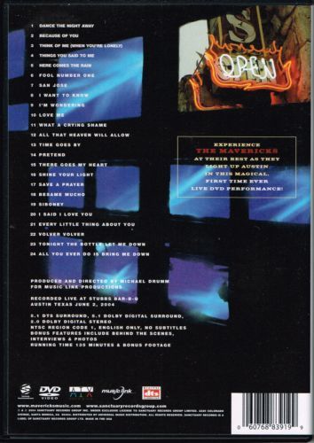 The band hits the stage of Austin's Stubbs' Barbecue in 2004 for their first-ever live concert film DVD. Filmed around the release of their sixth, eponymous studio album, this live concert from The Mavericks captures them in all their glory. Filmed in Austin, Texas, in 2004, the band rock the sizeable crowd at the Stubbs' Barbecue venue with a wide selection of material from their career. The band were undergoing a creative renaissance at the time, having staged a spectacular comeback after a 6-year break from the business. Refreshed and rejuvenated, the band perform with the passion of a group of youngsters just getting started, and deliver a great set of rocking tunes. Among them are "Here Comes The Rain", "Dance The Night Away", "All You Ever Do Is Bring Me Down" and many others.
