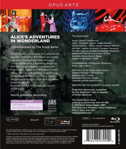 A full-length ballet created by choreographer Christopher Wheeldon for the Royal Ballet at the Royal Opera House, Covent Garden. The ballet is based on Lewis Carroll's famous story of Alice, an ordinary girl who one summer afternoon falls down a rabbit hole and finds herself on an extraordinary adventure. The music is by Joby Talbot, with designs by the internationally acclaimed Bob Crowley. Alice is danced by the Royal Ballet's Lauren Cuthbertson, and actor Simon Russell-Beale plays the cameo role of the Duchess.