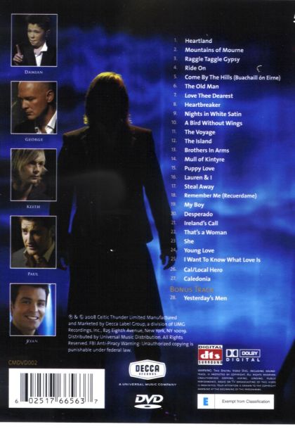 The group features five Celtic male vocalists from Ireland and Scotland, ranging in age from 16 to 40: Paul Byrom, George Donaldson, Keith Harkin, Ryan Kelly and Damian McGinty. From rousing ensemble numbers to solos showcasing each members' vocal style and personality, Celtic Thunder performs powerful ballads, popular hits, and heartwarming songs of love and loss from across the Celtic music spectrum-Irish, Scottish, traditional and contemporary.