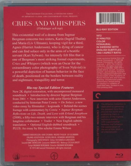 As Agnes slowly dies of cancer, her sisters are so deeply immersed in their own psychic pains that they can't offer her the support she needs. Maria is wracked with guilt at her husband's attempted suicide, caused by his discovery of her extramarital affair. The self-loathing, suicidal Karin seems to regard her sister with revulsion. Only Anna, the deeply religious maid who lost her young child, seems able to offer Agnes solace and empathy.