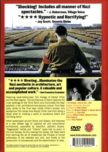 Featuring never-before-seen film footage of Adolf Hitler and the Nazi regime, The Architecture of Doom captures the inner workings of the Third Reich and illuminates the Nazi aesthetic in art, architecture and popular culture. From Nazi party rallies to the final days inside Hitler's bunker, this sensational film shows how Adolf Hitler rose from being a failed artist to creating a world of ponderous kitsch and horrifying terror. Hitler worshipped ancient Rome and Greece, and dreamed of a new Golden Age of classical art and monumental architecture, populated by beautiful, patriotic Aryans. Degenerated artists and inferior races had no place in his lurid fantasy. As this riveting film shows, the Nazis went from banning the art of modernists like Picasso to forced euthanasia of the retarded and sick, and finally to the persecution of homosexuals and the extermination of the Jews.