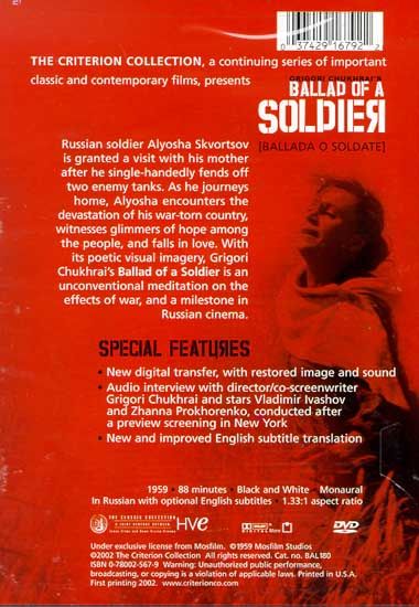 During World War II, earnest young Russian soldier Alyosha Skvortsov is rewarded with a short leave of absence for performing a heroic deed on the battlefield. Feeling homesick, he decides to visit his mother. Due to his kindhearted nature, however, Alyosha is repeatedly sidetracked by his efforts to help those he encounters, including a lovely girl named Shura. In his tour of a country devastated by war, he struggles to keep hope alive.
