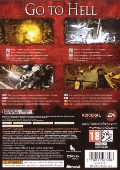 EA's Dante's Inferno tells an adapted story that focuses on delivering a blockbuster 3rd person action game experience while bringing Alighieri's depiction of Hell to the medium. Players assume the role of Dante, who descends into Hell after returning home to find his beloved Beatrice murdered, with Lucifer seducing her soul into the underworld. Dante sets out on a rescue mission to save Beatrice, but he soon realizes he is also in Hell to face his own demons and ultimately to redeem himself. Players will take Dante through nine unique circles of Hell as mapped out and described by Alighieri: limbo, lust, gluttony, greed, anger, heresy, violence, fraud and treachery. Each circle will showcase its own distinct look, with demons, monsters, damned and geography that are crafted straight from the poem's vivid descriptions. To take down the demons of Hell, Dante is outfitted with two primary weapons: the Scythe he takes from Death and the Holy Cross given to him by Beatrice, which has spiritual powers that will help Dante collect souls and spells from the creatures he defeats on his journey. The game also features a deep upgrade system so gamers can customize their abilities to their specific gameplay style, something they'll need as Dante comes face to face with Hell's fiercest beasts and bosses. If successful, Dante will be able to tame certain beasts, exacting their will and turning Hell's punishments back on itself. Built on the same technology as the award-winning Dead Space, Dante's Inferno will deliver a fast, fluid and responsive combat experience running at 60 frames per second, a must-have for the action adventure genre. The game is being built by Visceral Games, with the same attention to polish the studio has become known for with Dead Space.