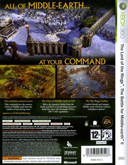 Command the epic battles of Middle-earth from your living room couch in The Lord of the Rings, The Battle for Middle-earth II for the Xbox 360. The highly anticipated PC game will make its exclusive console debut when it ships in Summer 2006! To add to the intensity of the experience, The Lord of the Rings, The Battle for Middle-earth II for the Xbox 360 is the first game in The Lord of the Rings series that will be playable over Xbox LIVE*. Challenge friends online and engage in intense, action-packed real-time battles. Based on the PC version of the same name, The Lord of the Rings, The Battle for Middle-earth II for the Xbox 360 will bring players into the heart of Middle-earth to live the battles seen in the blockbuster New Line Cinema films and classic J.R.R. Tolkien literary fiction. The game boasts a new and intuitive console-specific control scheme that will allow novice players to enjoy the game's signature strategy gameplay while giving expert players the flexibility needed to engage in a deeply complex strategy experience. Directly control hundreds of units in an attempt to defeat enemy armies, conquer new lands, and seal the fate of Middle-earth.