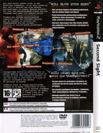 Bringing a new dimension to stealth action games, Second Sight gives players control of a character endowed with incredible psychic abilities. The game offers multiple approaches to completing levels either via stealth, dramatic gunplay, psychic powers or a combination of all three. The ability to psychically influence characters and remotely manipulate objects and individuals provides for a totally fresh gameplay dynamic.